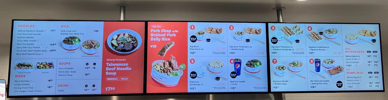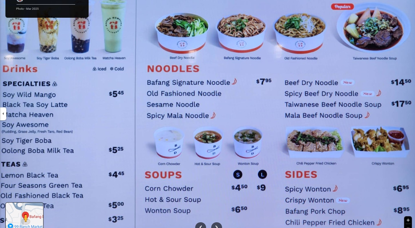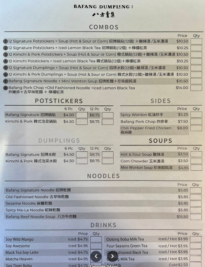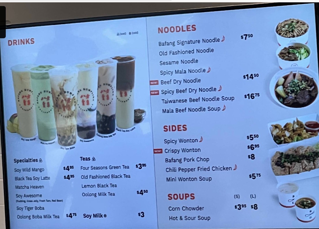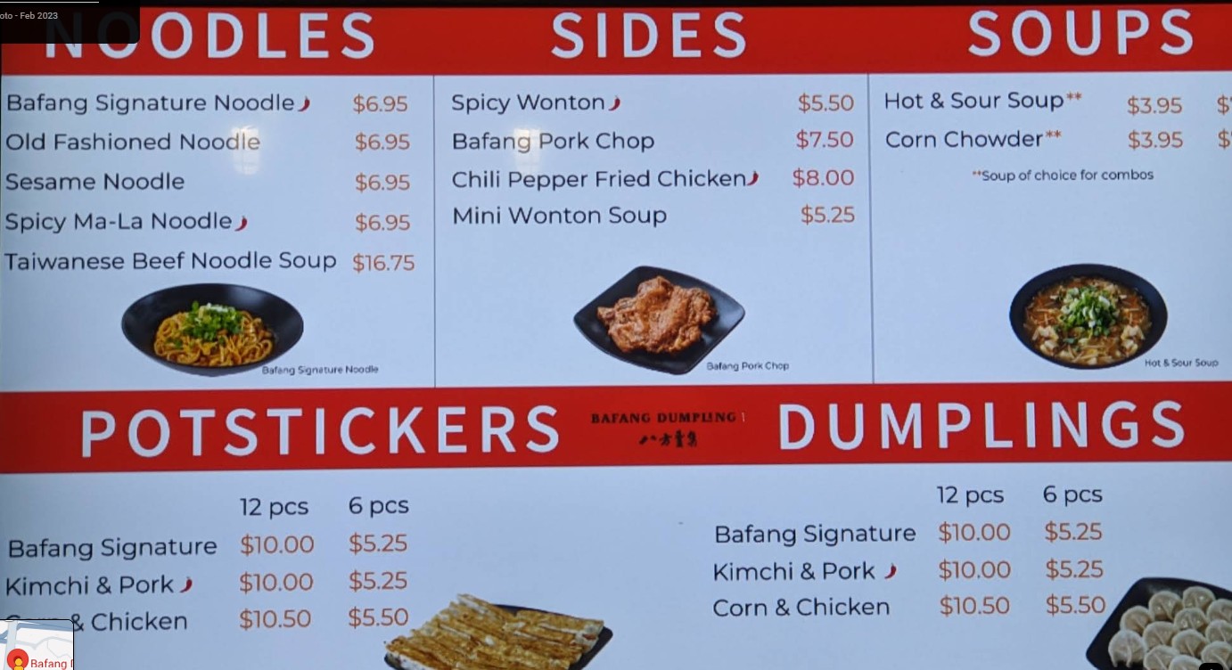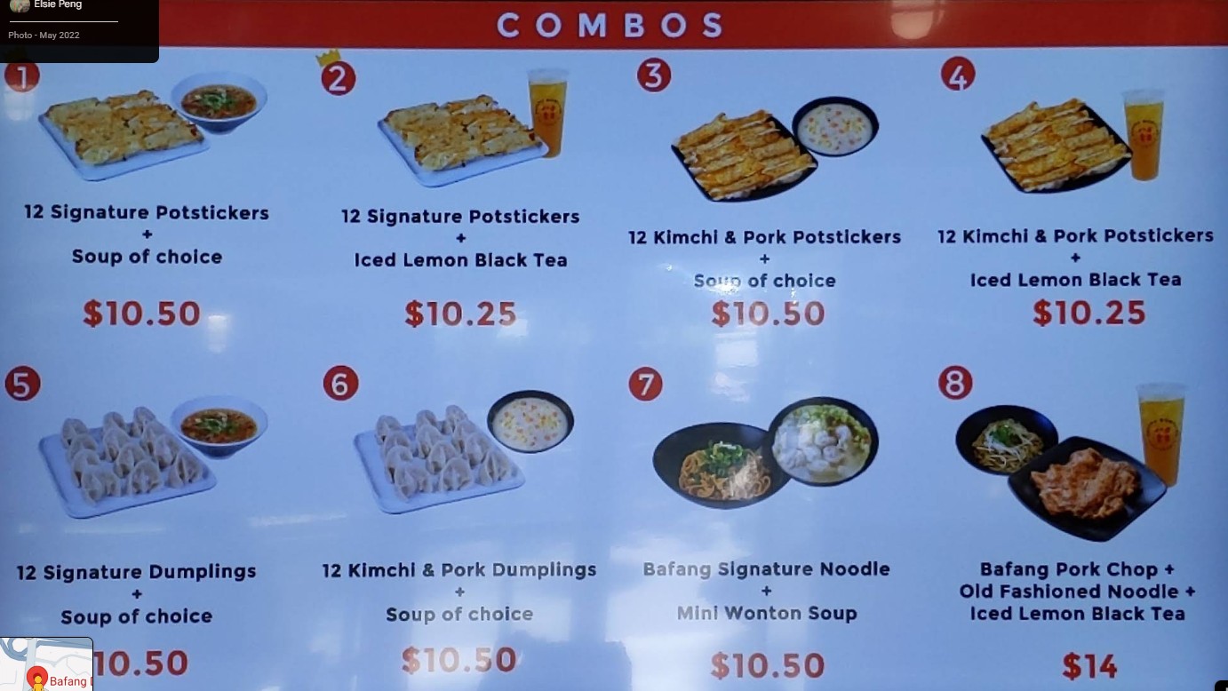 Decent higher end fast food chain. For this location, potsticker is a must! And probably anything noodles. We didn't get dumplings here as I don't remember caring too much from a different location. But for potsticker, I'll request it to be fried longer next time. Bafang is a chain. I feel it's like a Din Tai Fung (chain, cleaner sterile or commercialized version so it's not awesome, it's just minimal decent). It's probably the lowest or minimum expectations of taiwanese food. The SO says he'll rare this place 6 out of 10 haha The food to sauces just reminds you of almost higher end fast food but Taiwanese style. $17.50 Beef Noodle Soup is huge!!! It's not included in any combo. Broth was okay, a bit water down but at the same time salty with it's soy sauce taste? I can taste the herbs inside but it's definitely overpowered. The meat is okay, not tender but it is edible. $16.50 Pork Chop, Signature Noodle and lemon black tea combo was simple. Pork chop was very underwhelming. It felt like a McDonald patty. Noodles were great! Lemon black tea is not customizelable; you can't change the sweetness in it. It's more zesty and less sweet than hong kong cafe types in Monterey Park. Also, a different review said they got boba milk tea but the staff told us only lemon black tea.....guess there's inconsistency in info? $6.50 6pc Potstickers filling was delicious, and I loved the skin but the bottom fried side needed to be fried more. If it was fried longer for a crisp, it would be perfect!! I love the thin skin. Different from northern style or canto thicker skin. Random but the restrooms are a bit weird with their lock. Anyone with hand arthritis issues will have a difficult time with it. There's no towels but air blow dryer. I noticed lots of toilet seat covers in the trash can. The staff cleaning the table was pretty rude in directing us to the trash area.