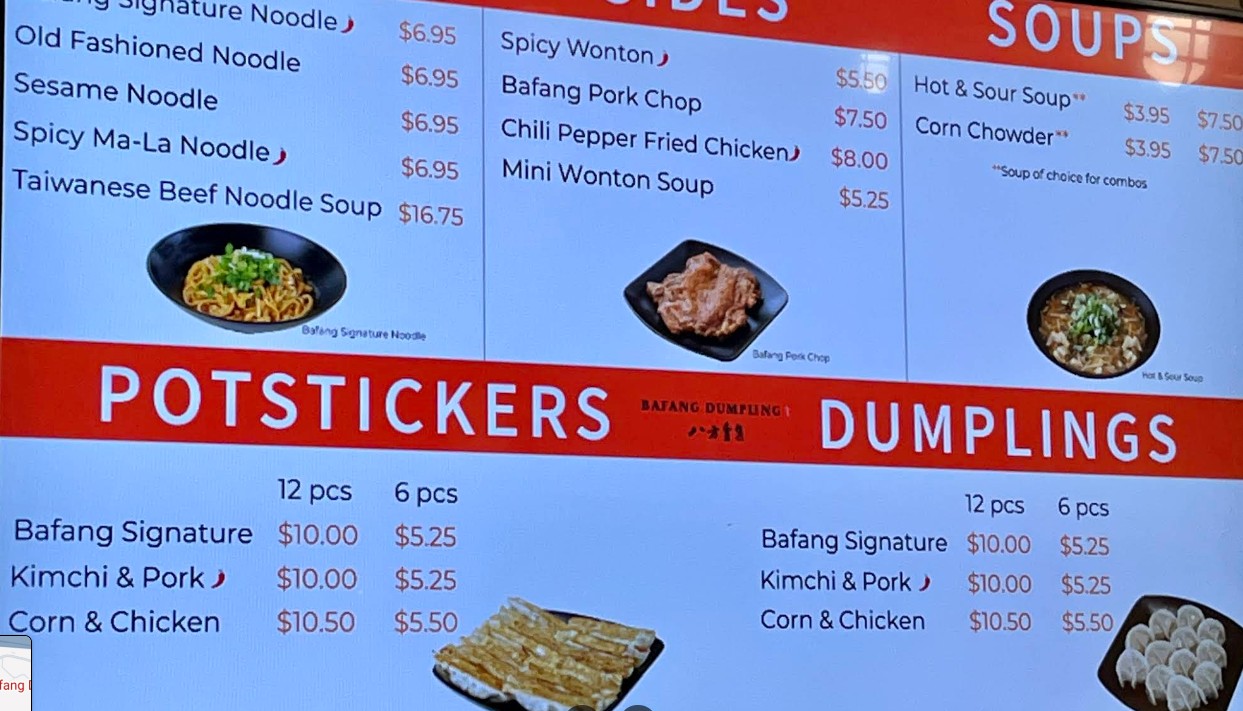 They have a decent variety of pot stickers and noodles. Maybe less authentic than a full fledged dumpling restaurant, but it still hit the spot. I had the combo number three, which has six signature dumplings and six signature potstickers and a big bowl of corn chowder for $14.95. It was definitely a decent size portion. My daughter had the bowl of beef dry noodles for $14.50. She enjoyed it. The corn chowder leaves room for improvement. I didn’t know it had egg in it and it was a bit watery.